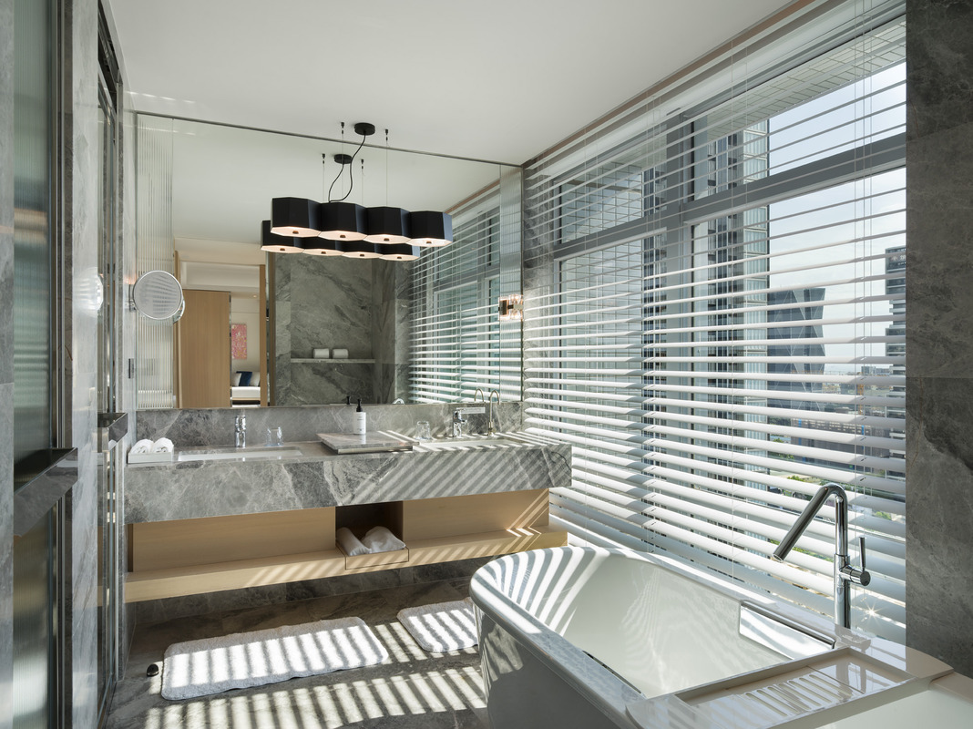 TOTO integrated automatic washlet toilet / EU-certified organic bath amenities / GROHE rainforest shower system / KOHLER freestanding cast iron bathtub