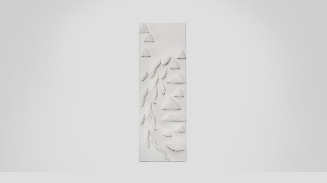 透過水墨畫的皴法線條、暈染色塊等元素,解構成作者創作中最簡約、低限的造形,重組成如象形文字般的圖像符號「物件」;