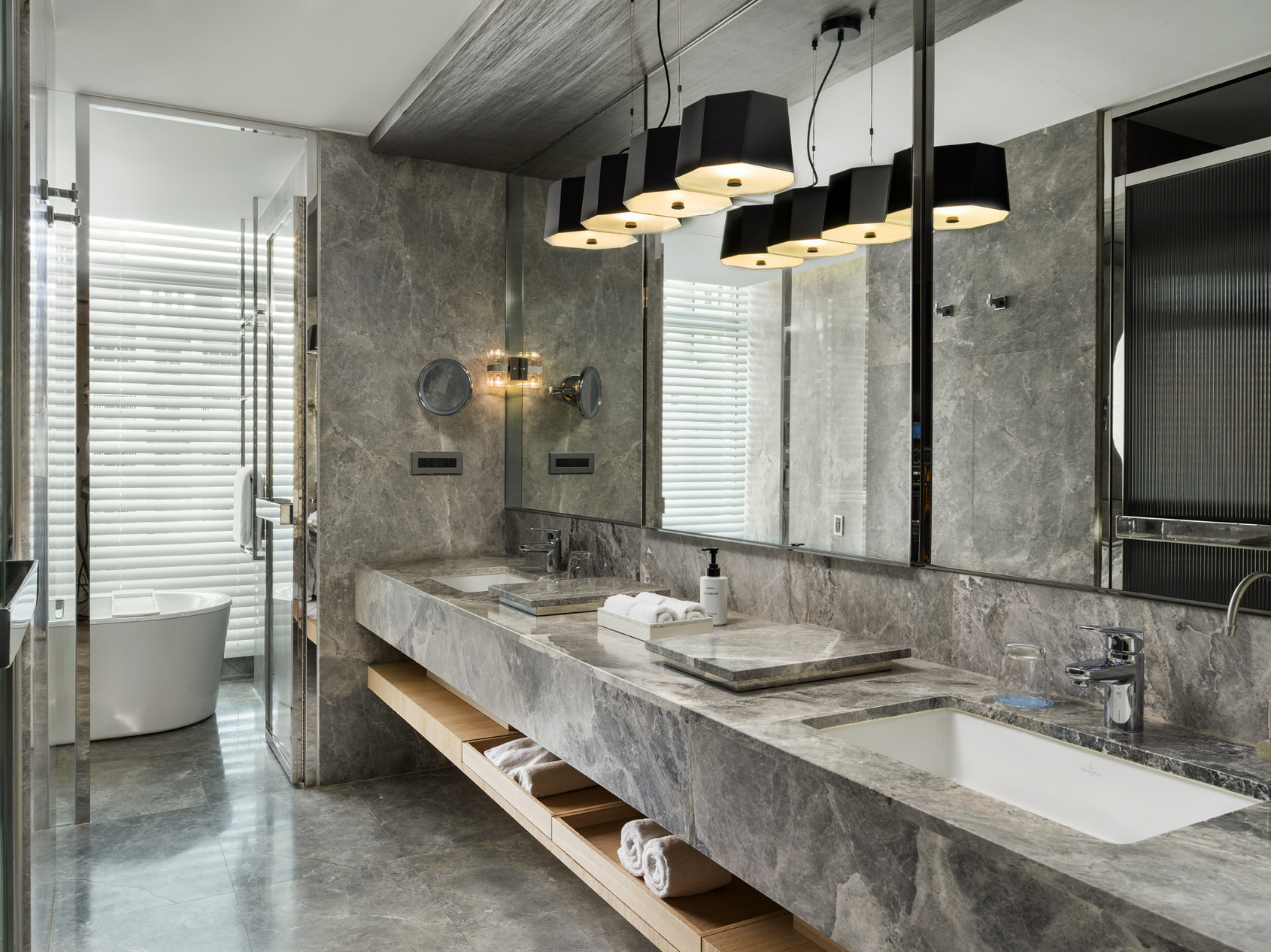 這裡遼闊的海景、往來的遊船與城市裡的大千世界,構成房裡最動人的風景。近在眼前的夕陽雲霓,灑落單面落地全景窗,水色映入眼簾。 引自然光影入房,碧灰色大理石衛浴空間,寬敞舒適。